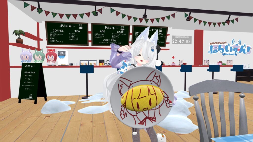 ドリンクやケーキなどを楽しみながら、キャストのホライズちゃんとお話しできる、そんな楽しい空間です。