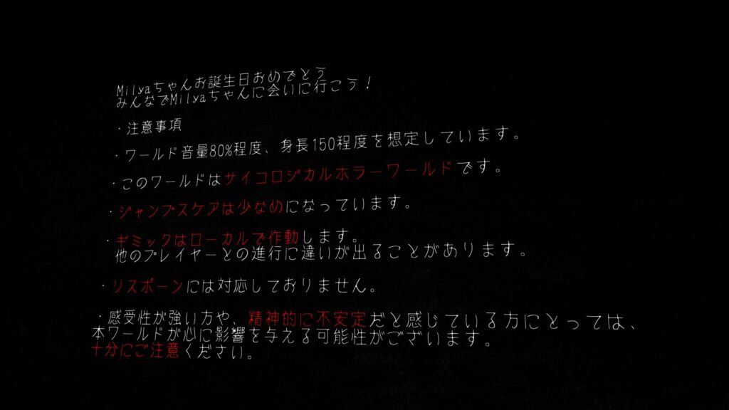 2024年のvketのホラーワールドです。vket公式のワールドになりますのでそこまでめちゃくちゃ怖いというよりクオリティとストーリー性が高いと言った感じのワールドです。