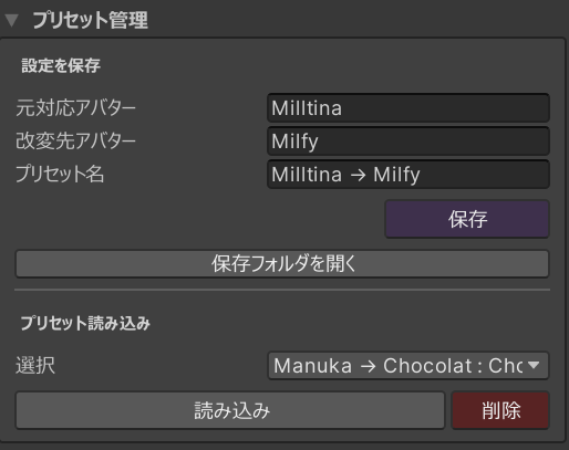 自分がわかりやすいように、元対応アバターや改変先アバターやプリセット名を決めてください。