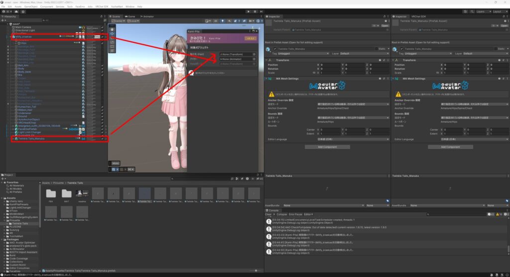 まず、髪をHierarchyのアバター直下にドラッグ&ドロップします。
