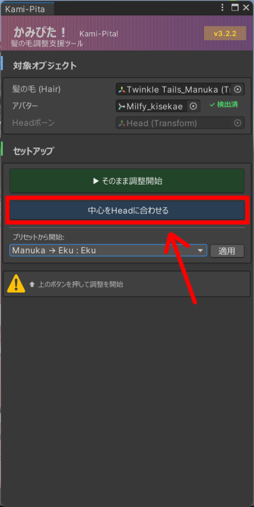 位置調整は、ツールのメニューにある「位置調整」・Hierarchyの髪のオブジェクトのどちらからでも行うことができます。