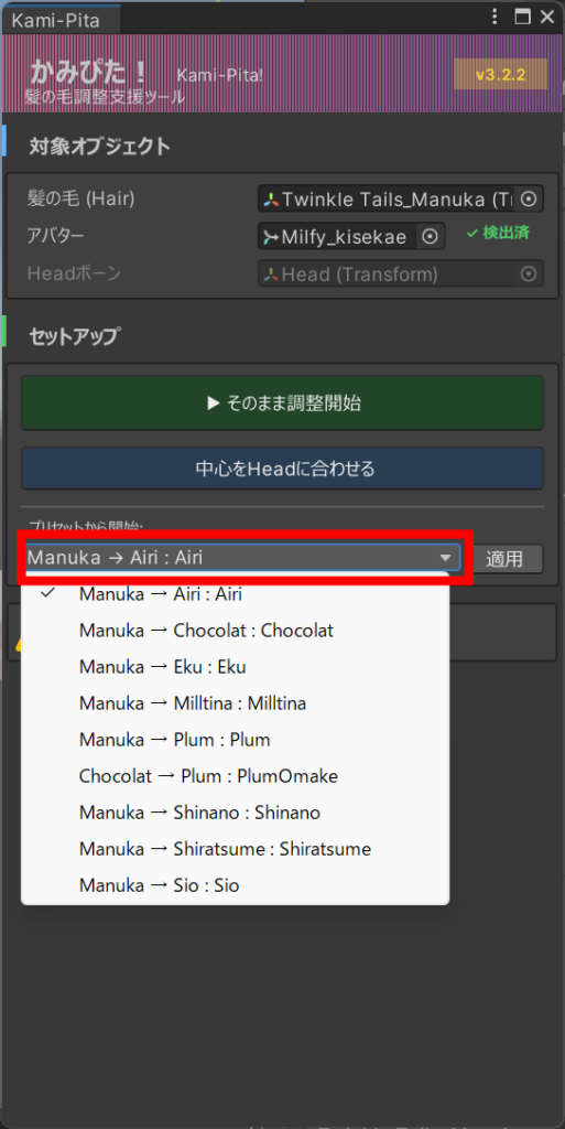 最後に、「プリセット開始」の部分を変換元のアバターと変換後のアバターを指定します。