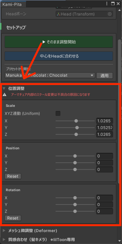 - 非対応の髪をアバターに合わせる(プリセットがある場合)