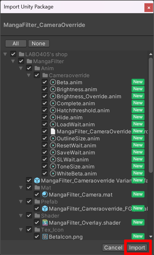 開いたら、ダウンロードした「MangaFilterShader」をプロジェクトにインポートしてください。