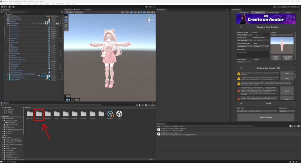 「MangaFilterShader」を導入したいアバターのプロジェクトを開きます。