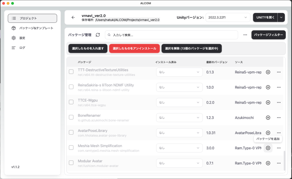 すると、VCCのパッケージ追加の部分に「Meshia Mesh Simplification」が追加されているのでプロジェクトに追加します。