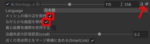 また、形が破綻してしまう場所などは歯車マークから「メッシュの端の辺を保持」「なだらかな曲面を保持」を有効にしたりして調整します。