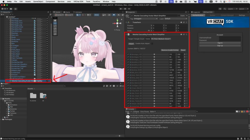 • 「Meshia Cascading Avatar Mesh Simplifier」でアバターに適用