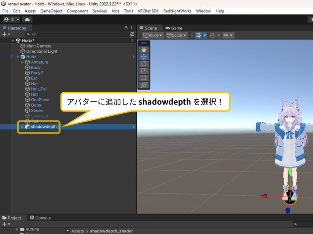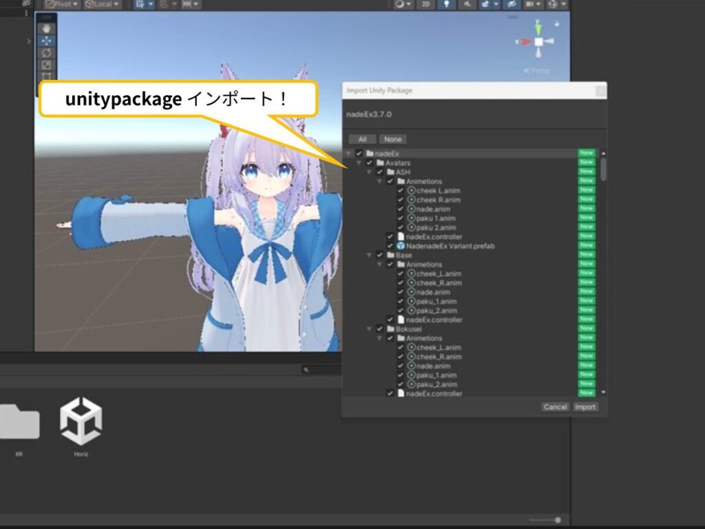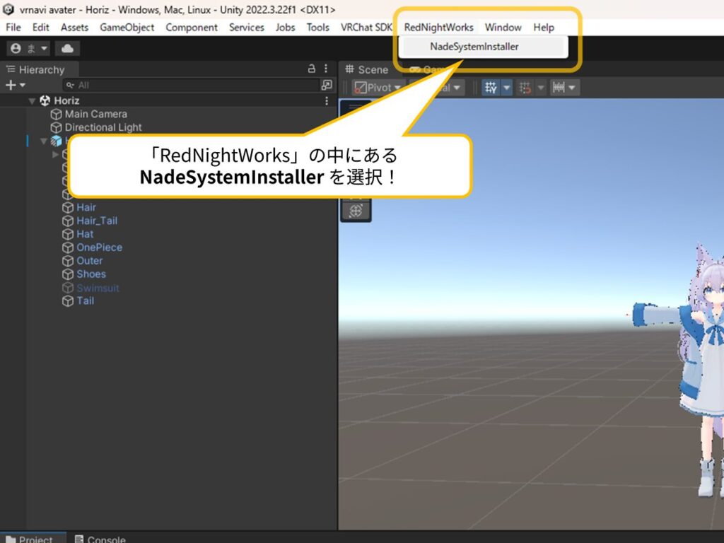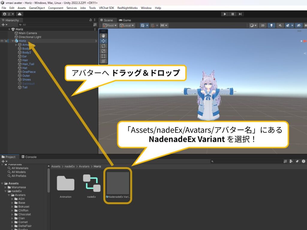 この解説ではホライズちゃんを使っているので、「Assets/nadeEx/Avatars/Horiz」のフォルダ内の「NadenadeEx Variant」を使っています。