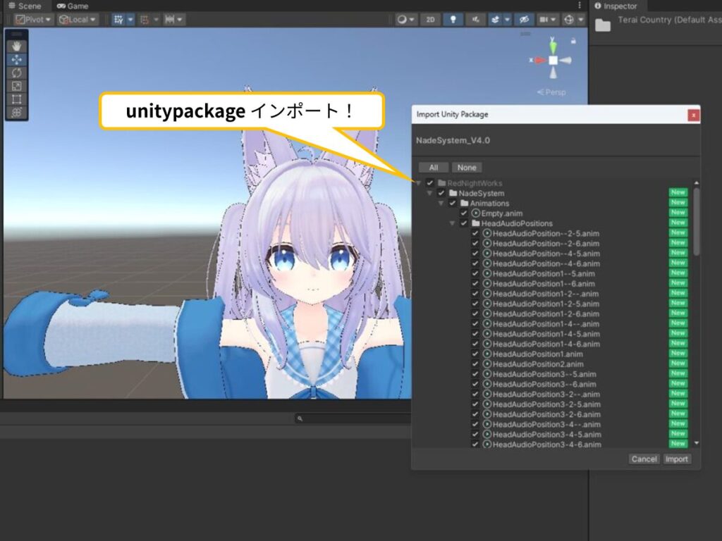 ダウンロードしたら、ファイルの中にある「unitypackage」をインポートします。