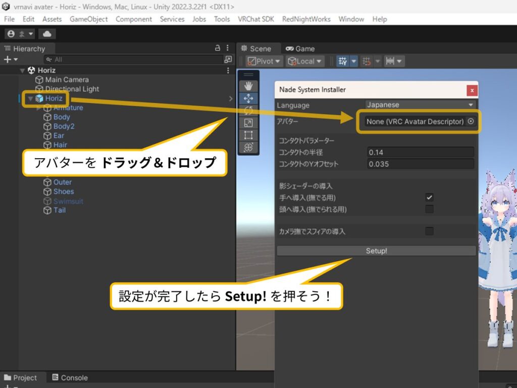 次に「Assets/nadeEx/Avatars/アバター名」のフォルダに入っている「NadenadeEx Variant」をアバター内に配置してください。