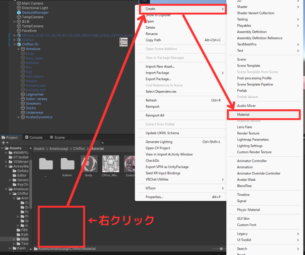 Createを選択(くぐらせた状態で)Materialをクリックします。