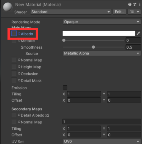 Albedoの左隣にある■に使用するテクスチャをドラッグ&ドロップします。