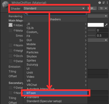 Shaderをクリックし、下側にあるlilToonを選択します。
