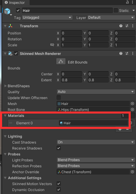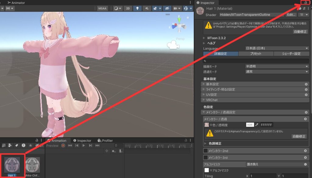 複製したマテリアル(Hair 1)を選択し、Inspectorの🔓マークを押してロックをかけておきます。