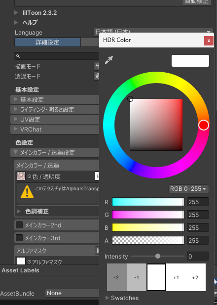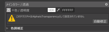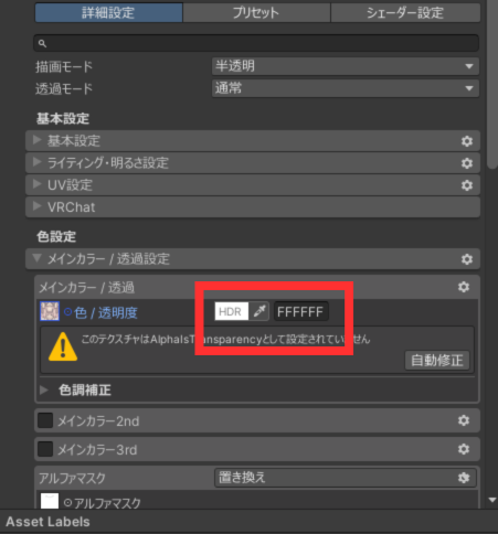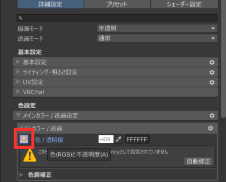 lilToon内の設定からメインカラー/透過設定のHDRをクリックします。
