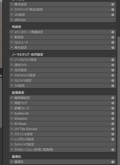 画像の通り、設定項目だけでもこれだけあるので、特別なことをしなければlilToonで問題ありませんね。