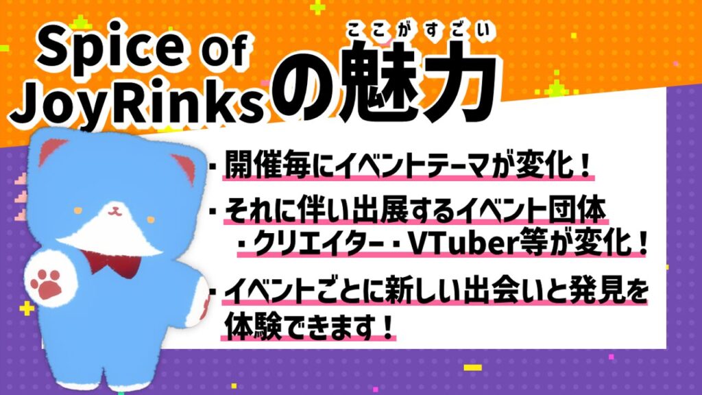 VRChatを舞台にした新しい展示イベント 「SpiceOfJoyRinks(スパイスオブジョイリンクス/略称:スパジョイ)」 が、2025年11月28日(金)〜30日(日)に初開催されます。