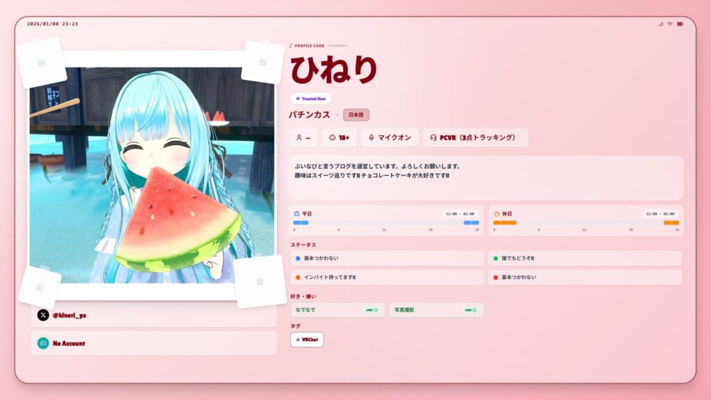 2026年1月に公開されたVRChat向けのプロフィールカード(Profile Card)も凄く雰囲気良く作れたのでこちらも紹介しておきます!!