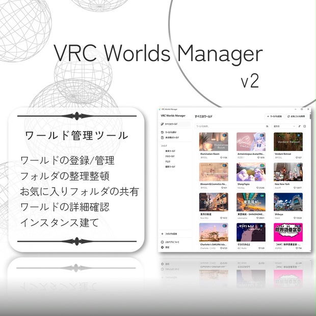 お気に入りがいっぱいで、素敵なワールドを保存できないことありませんか? VRC Worlds Manager v2は、そんなお悩みを解決するVRChatのお気に入りワールド管理ツールです。 旧VRC Worlds Managerからの移行も対応しております。旧バージョンからデータが失われることはないので、ぜひご安心してご利用ください。