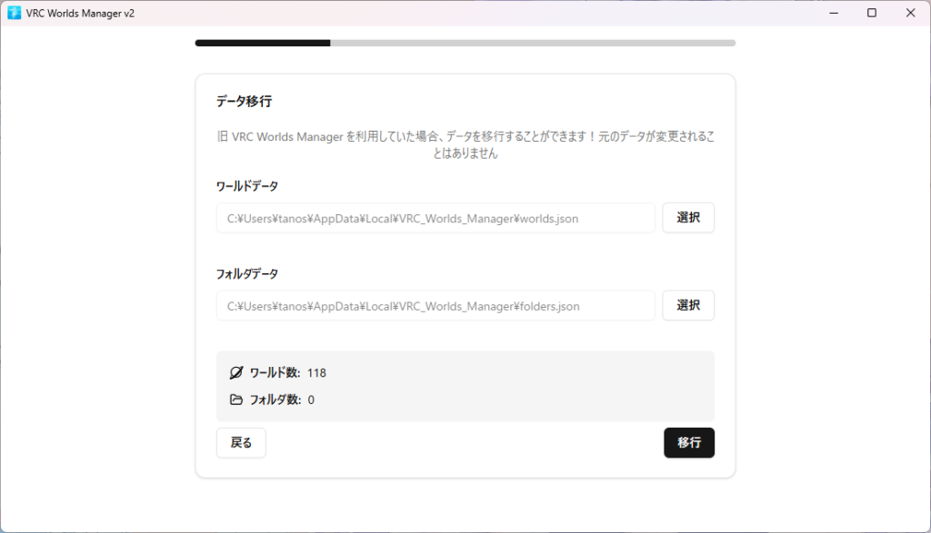 旧バージョンの VRC Worlds Manager を使っていた人は、ここでデータの引継ぎを行うことができます。