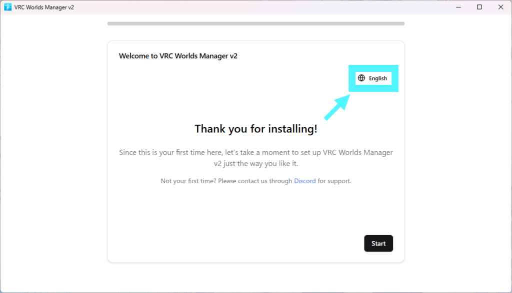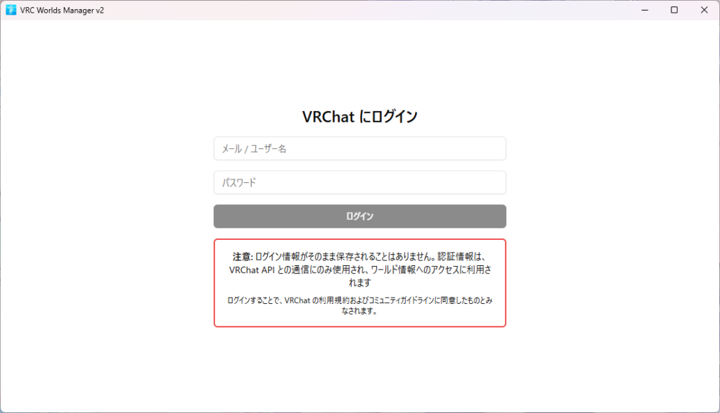 インストールされた VRC Worlds Manager を初めて起動すると、こんな画面が出てきます。