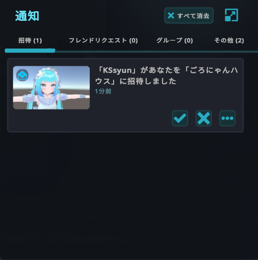 ここからインスタンスタイプと地域を選択して「インスタンスを作成」をクリックすると、実際にインスタンスが作成され、そのインスタンスへのインバイトが VRChatで届きます。
