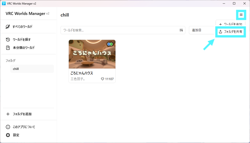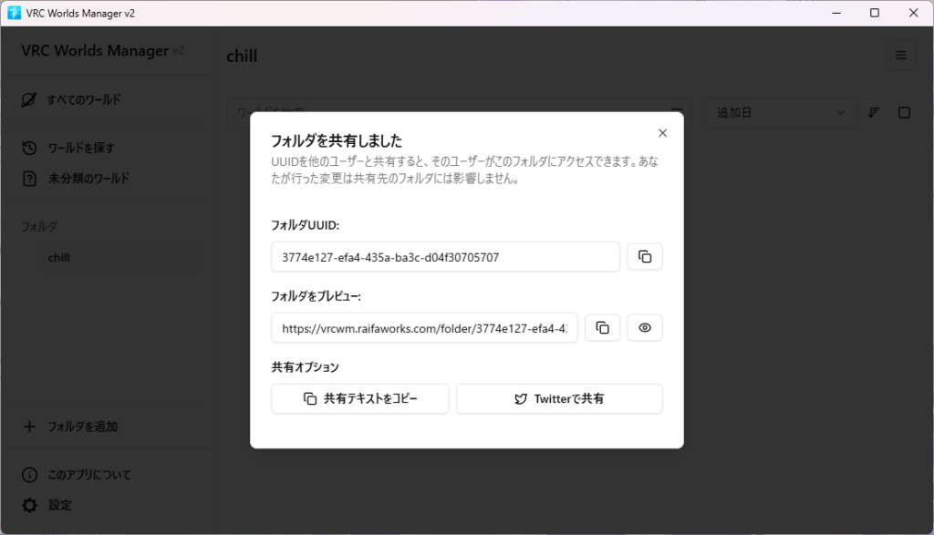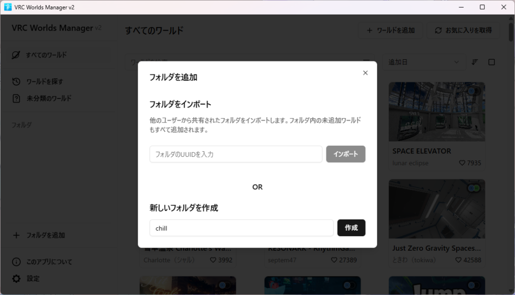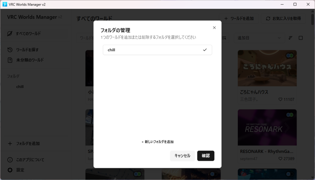 追加したいフォルダを選んで「確認」ボタンをクリックすると、フォルダにワールドが追加されます。