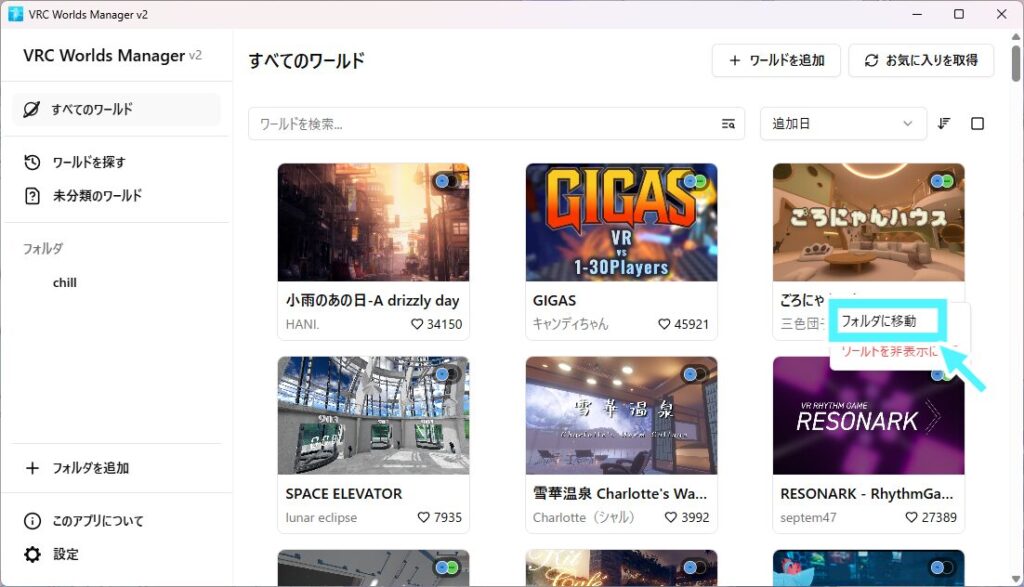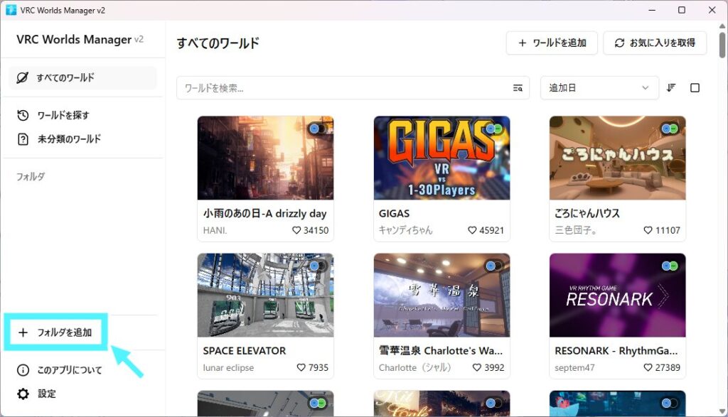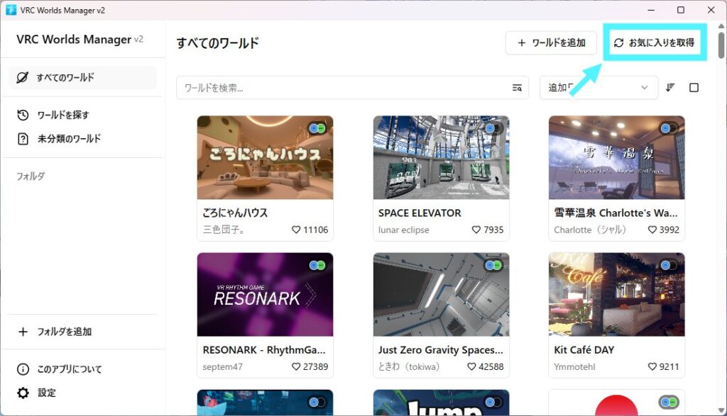 ここで、右上の「お気に入りを取得」をクリックすると、VRChatのFavoriteに入っているワールドを自動で取得して、アプリ内にワールドの情報が保存されます。