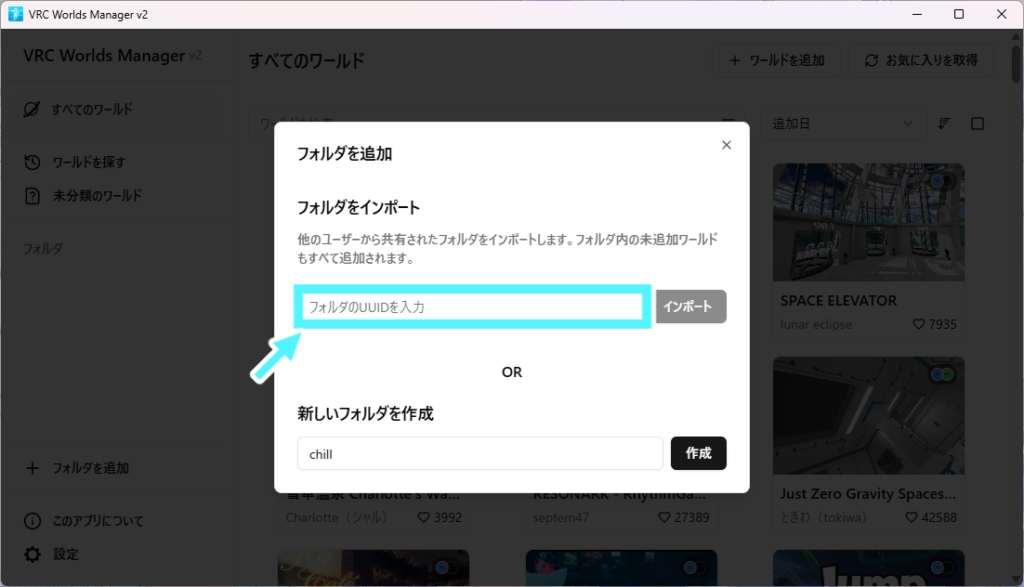 左下の「フォルダを追加」をクリックしてから、フォルダをインポートするための入力欄に受け取ったIDを入力します。