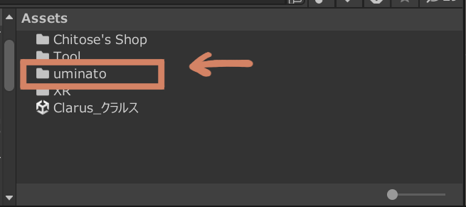 Assets内に「uminato」というフォルダが追加されていれば、正しくインポートができています。