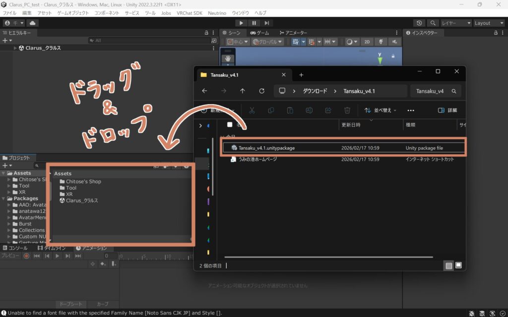 こちらを、Unity内「Assets」ウィンドウにドラッグ&ドロップしましょう。