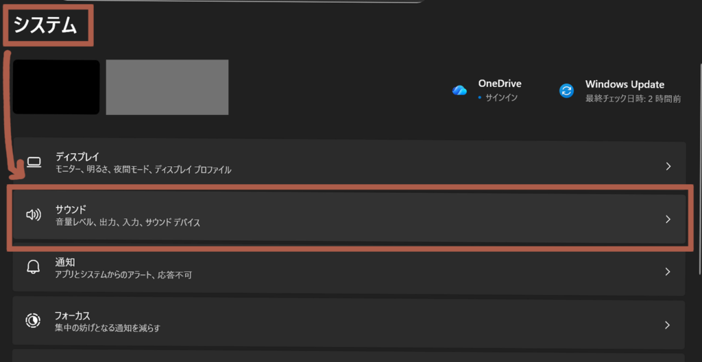 Windows設定アプリから「システム」→「サウンド」へと進みます。