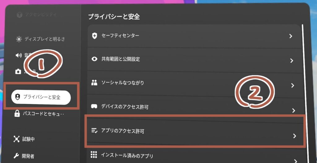 まずはQuest本体の設定アプリを開き、左側メニューの「プライバシーと安全」から「アプリのアクセス許可」をクリック。