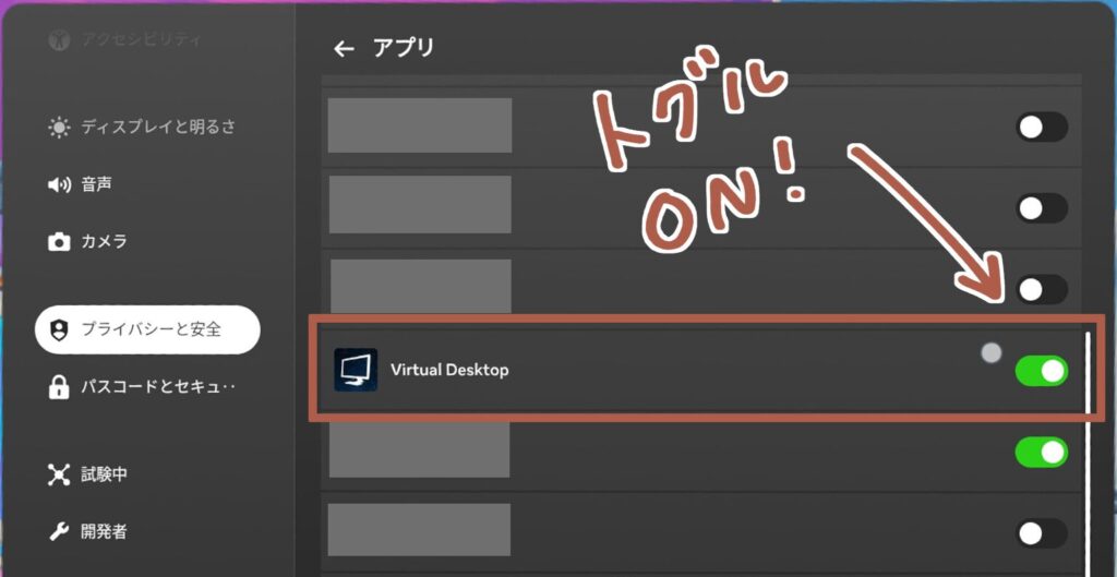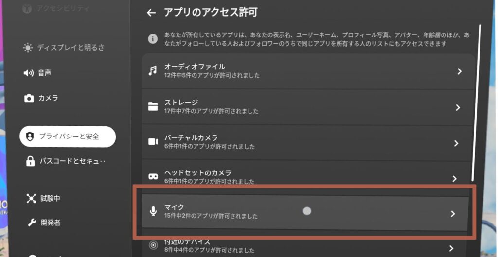 ちなみに「プライバシーと安全」→「インストール済みのアプリ」→「Virtual Desktop」と進み、その中の「アクセス許可」の項目にあるマイクをONにしても、同じ結果が得られます。
