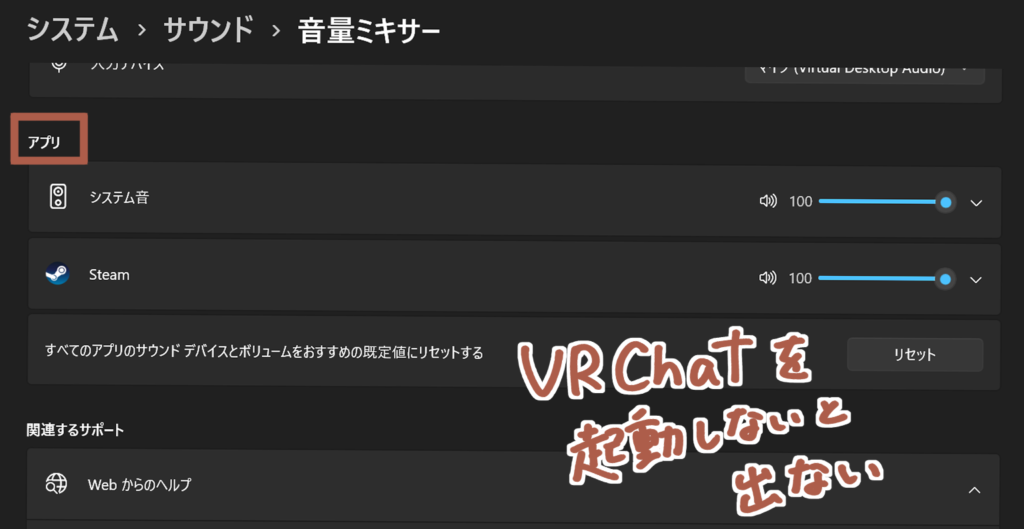 音量ミキサーでVRChatの「入力デバイス」を確認する
