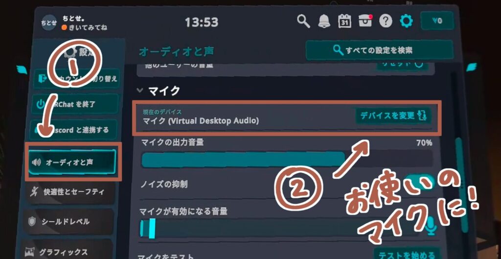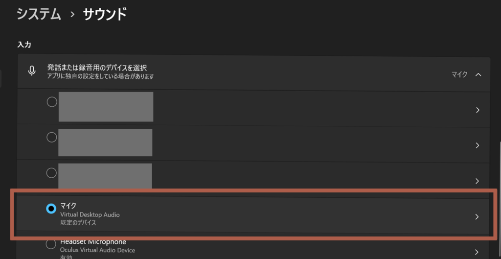 ちとせ 近くに「Headset Microphone」というそれらしい選択肢がある場合がありますが、Virtual Desktopでつなぐのであれば「Virtual Desktop Audio」でOKです。
