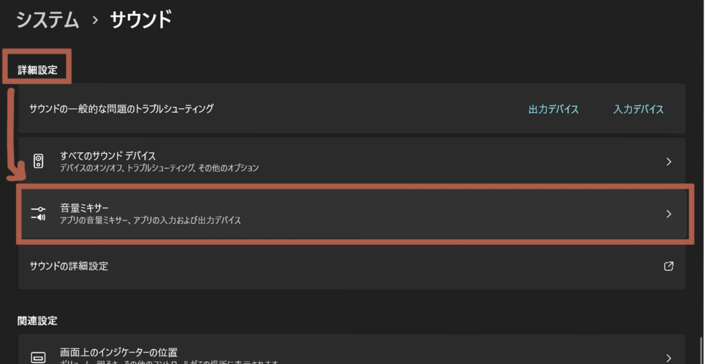 下の方へスクロールしていき、「詳細設定」項目の中にある「音量ミキサー」を選択してください。