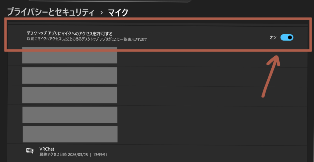 デスクトップアプリ(VRChat等)にマイクへのアクセスが許可されているか確認する
