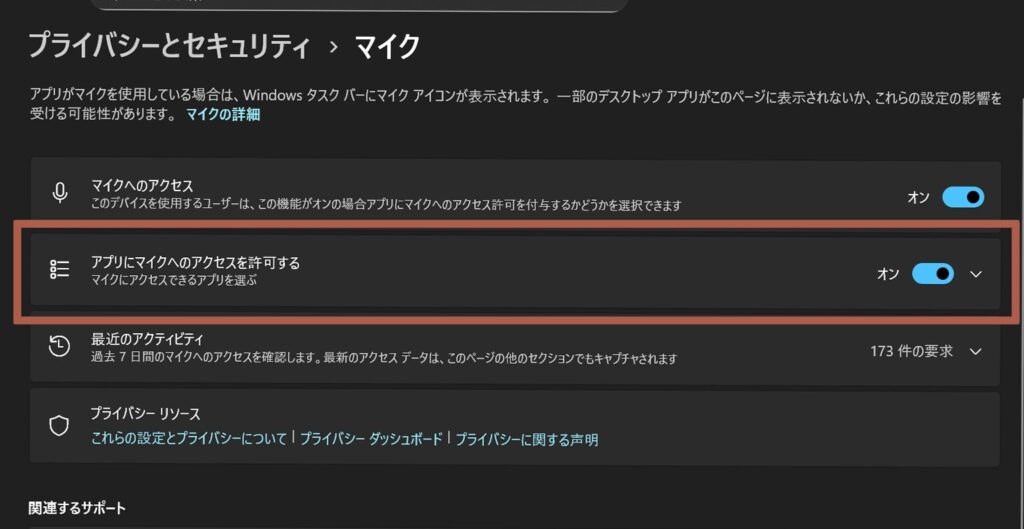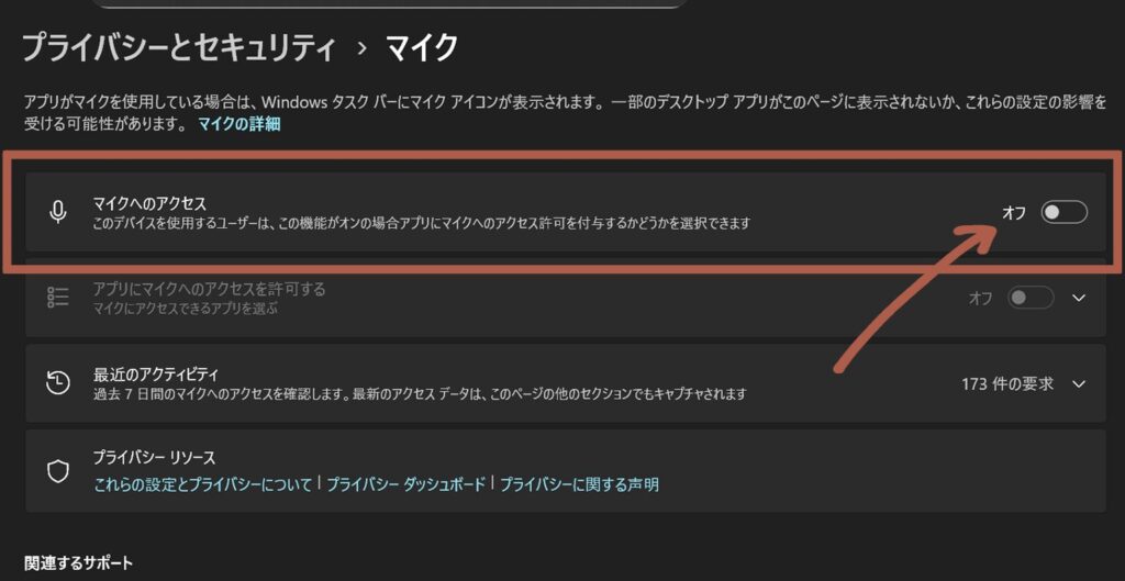 遷移したページの一番上にある「マイクへのアクセス」が該当項目です。トグルスイッチがONになっているか確認しましょう。