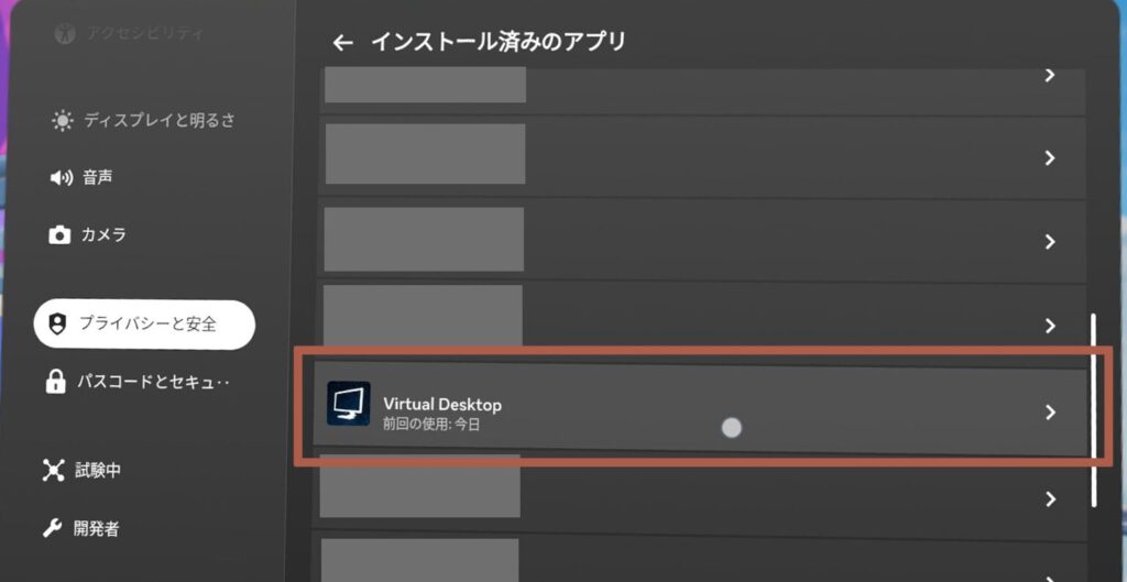 Quest本体にインストールしているアプリ一覧が出てくるかと思いますので、スクロールして「Virtual Desktop」を探してください。