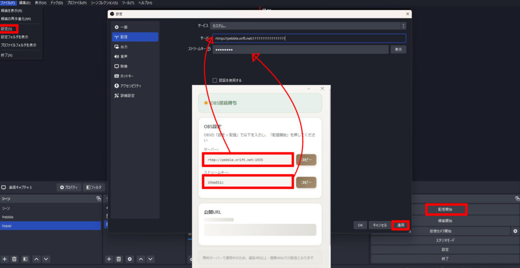 その後出てきたサーバーと、ストリームキーをOBSのファイル>設定から配信を開き、コピー&ペーストをし適用します。