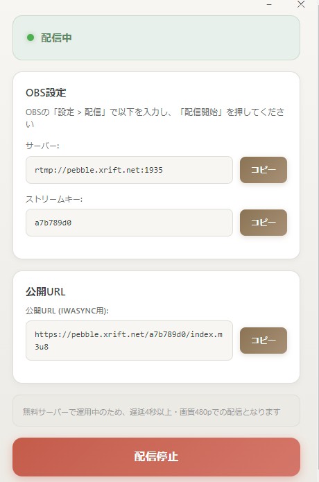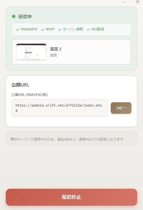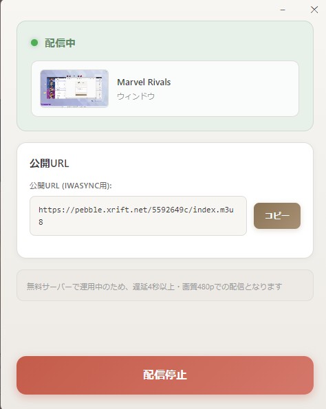 停止したい場合は【配信停止】を押したらその画面のまま配信が止まります。(ウィンドウを消しても止まります。)