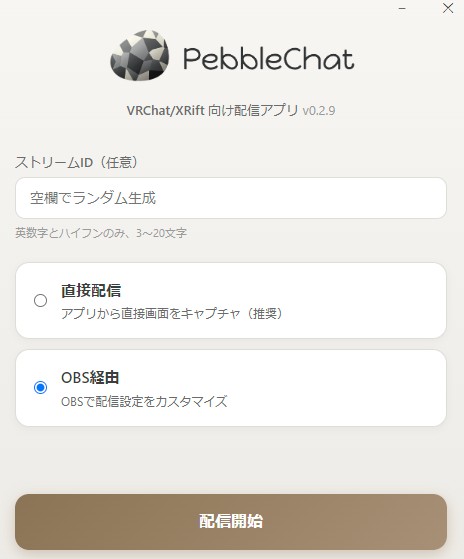 OBS経由のチェックボックスをクリックし、【配信開始】をクリックします。