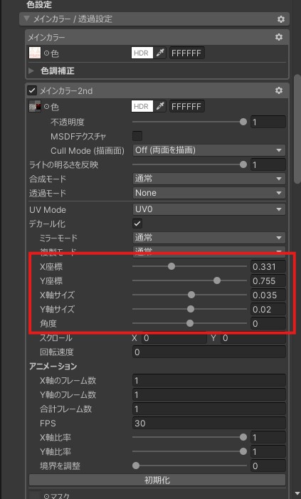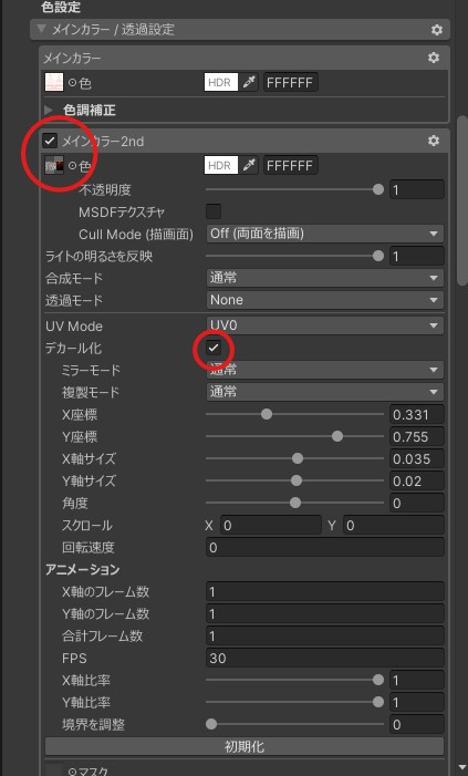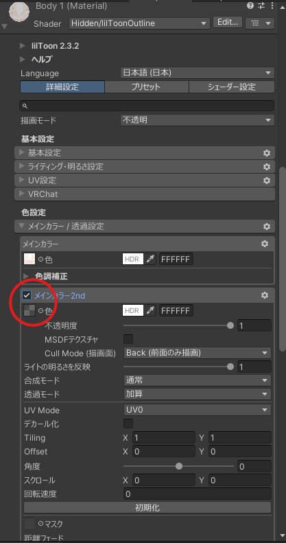 マテリアルの中の、2ndテクスチャにアバターに対応したタトゥーテクスチャを入れます。