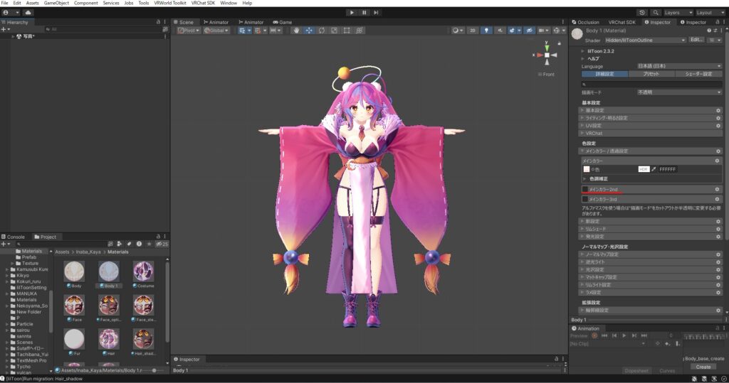 アバターのインスペクター(inspector)を開き、インポートしたマテリアルを開きます。