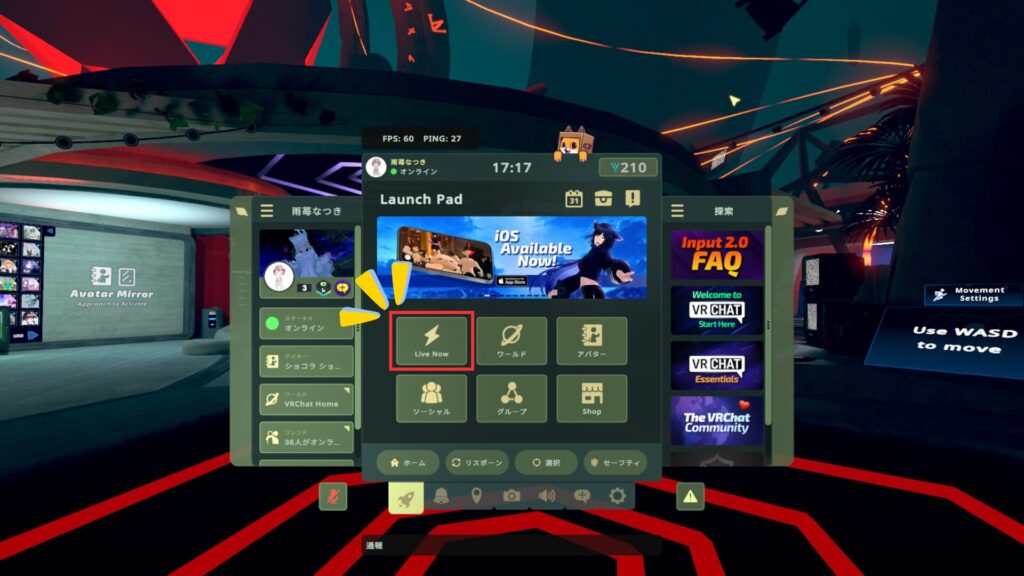 「Live Now」では、グループで開催されているイベントを一覧で確認することができます。また、フレンドのインスタンスを確認することもできます。