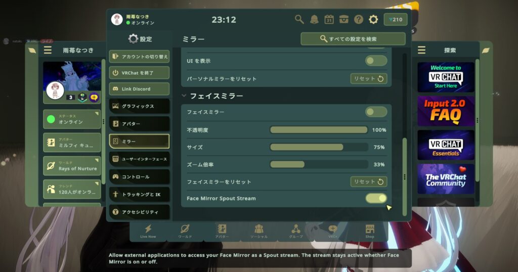 この機能を有効にすると、フェイスミラーの内容をSpoutを通じてOBSなどの外部ツールに送信できるようになり、VTuber活動がよりスムーズに行えるようになります。