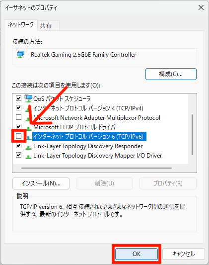 すると、プロパティが表示されるので「インターネット プロトコル バージョン 6 (TCP/IPv6)」のチェックボックスを外します。