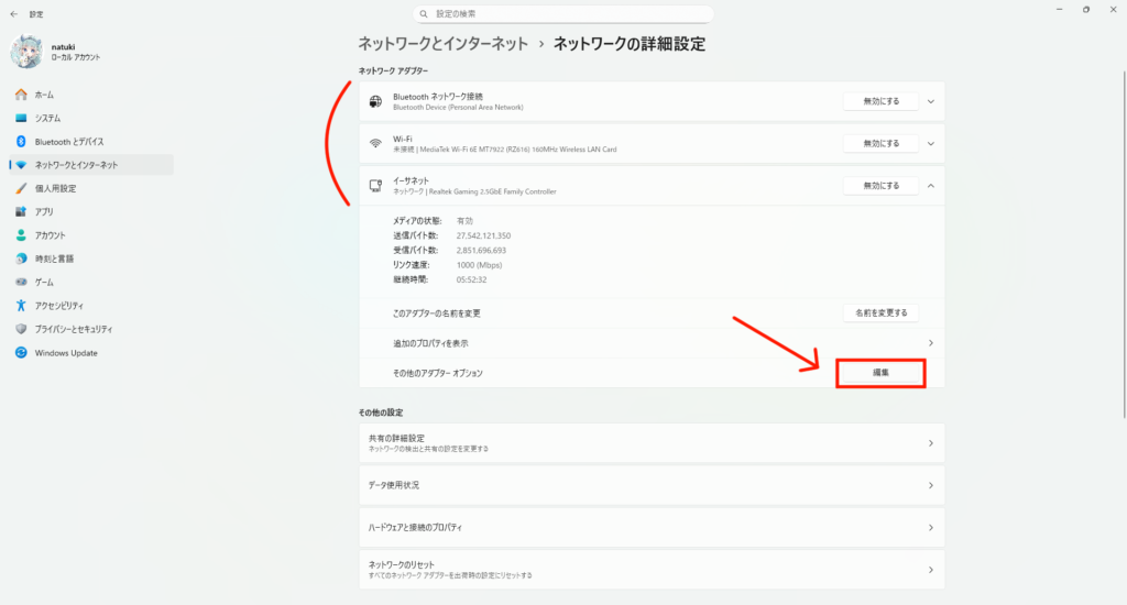 次に、使用しているインターネットのアダプターをクリックして「その他のアダプター オプション」の「編集」をクリックします。